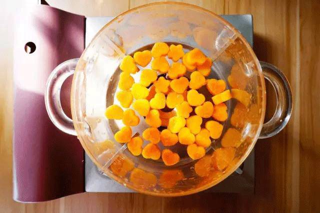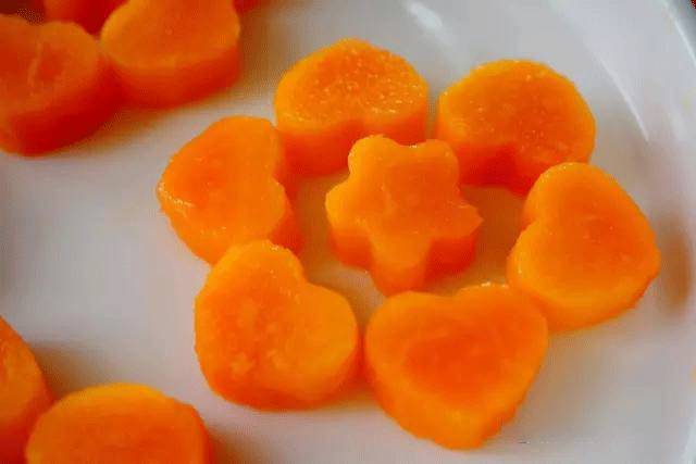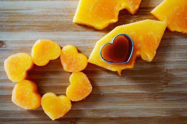 ⑤ 将木瓜肉切成片状,再用造型模具切割成宝宝喜欢的形状(没有模具,直接用刀切成小块即可);