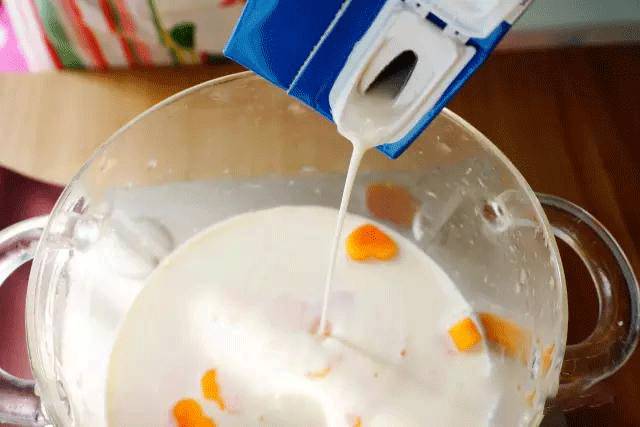 ⑧ 将适量的牛奶倒入汤锅(牛奶大约是食材量的1.5倍即可,1岁内用配方奶代替);