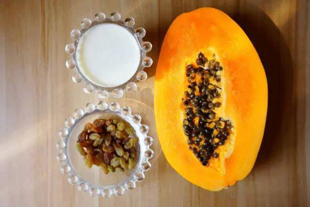 木瓜半个,纯牛奶300ml,葡萄干15g