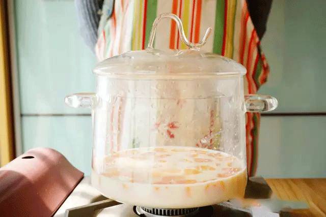 ⑩ 中火煮至微沸状,转小火煮3~5分钟即可(木瓜原本就能生吃,且富含VC,牛奶也不宜久煮);