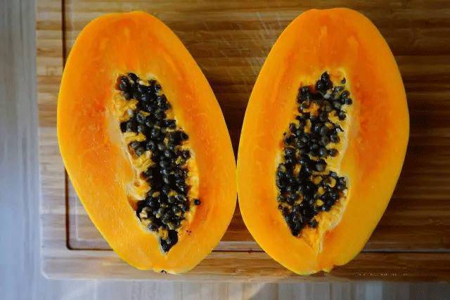 ① 挑选新鲜成熟的木瓜,对切成两半(优先挑选表皮橙黄色、瓜肉饱满的熟木瓜更甜);
